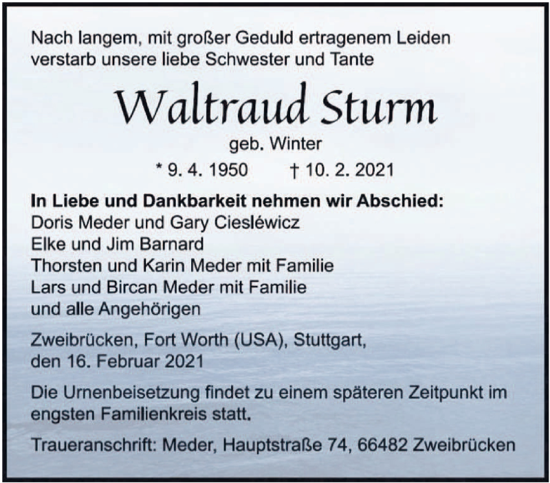 Hier finden Sie alle Traueranzeigen aus der Zeitung, die bisher für Waltraud Sturm erschienen sind. Weitere Traueranzeigen, die in der Zeitung erscheinen, werden hier ebenfalls aufgelistet