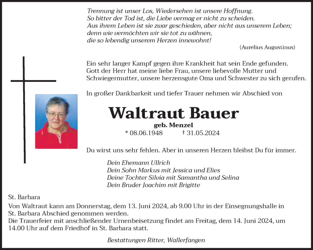 Hier finden Sie alle Traueranzeigen aus der Zeitung, die bisher für Waltraut Bauer erschienen sind. Weitere Traueranzeigen, die in der Zeitung erscheinen, werden hier ebenfalls aufgelistet