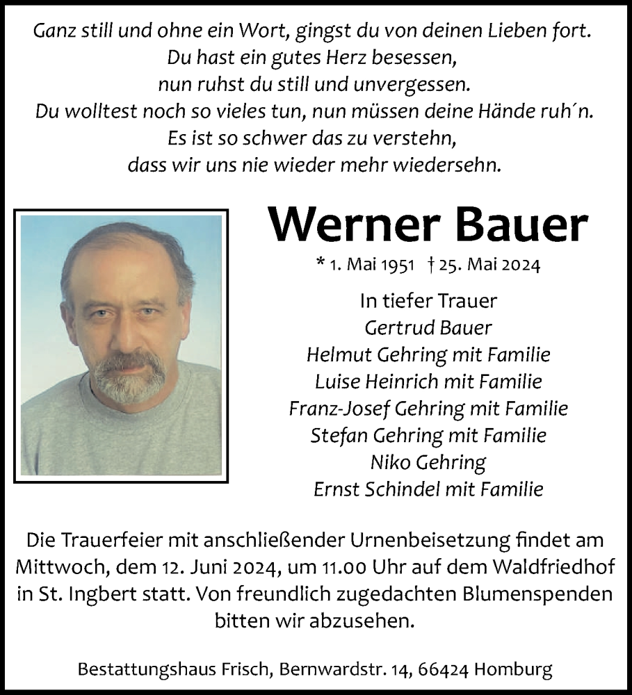 Hier finden Sie alle Traueranzeigen aus der Zeitung, die bisher für Werner Bauer erschienen sind. Weitere Traueranzeigen, die in der Zeitung erscheinen, werden hier ebenfalls aufgelistet