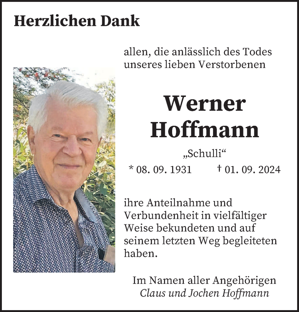 Hier finden Sie alle Traueranzeigen aus der Zeitung, die bisher für Werner Hoffmann erschienen sind. Weitere Traueranzeigen, die in der Zeitung erscheinen, werden hier ebenfalls aufgelistet
