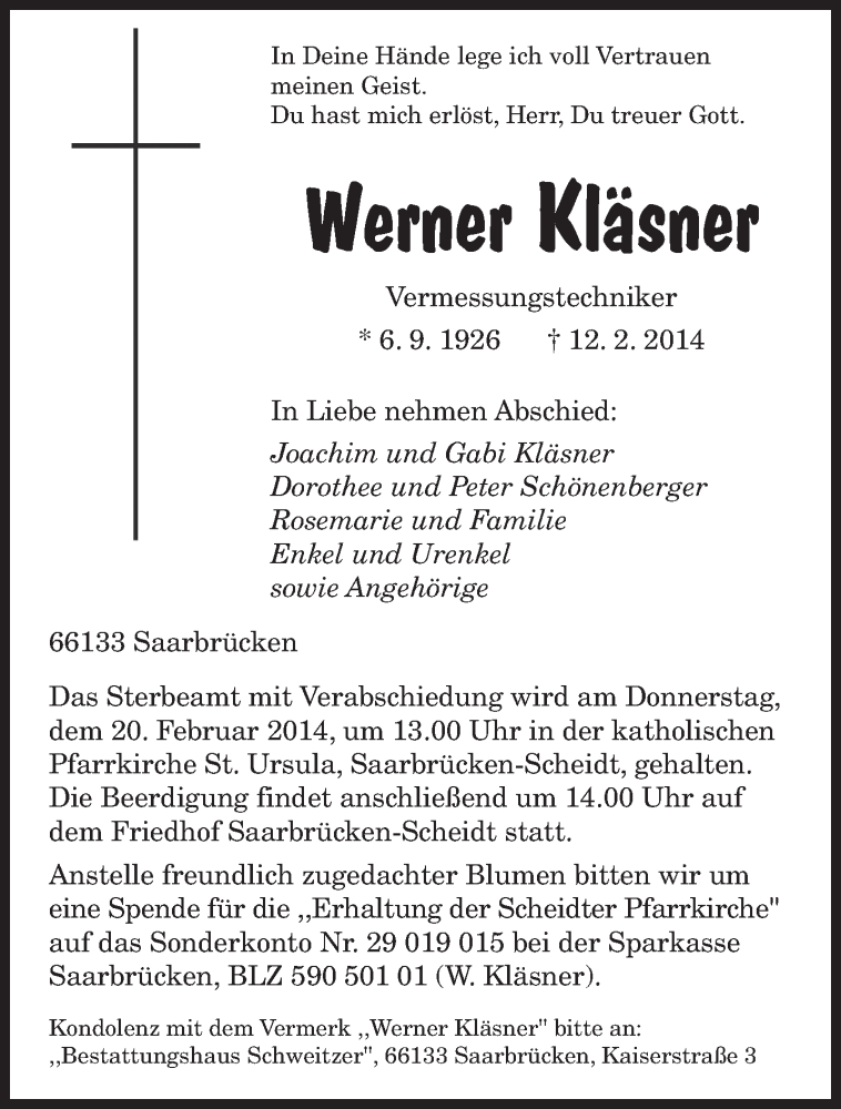 Hier finden Sie alle Traueranzeigen aus der Zeitung, die bisher für Werner Kläsner erschienen sind. Weitere Traueranzeigen, die in der Zeitung erscheinen, werden hier ebenfalls aufgelistet