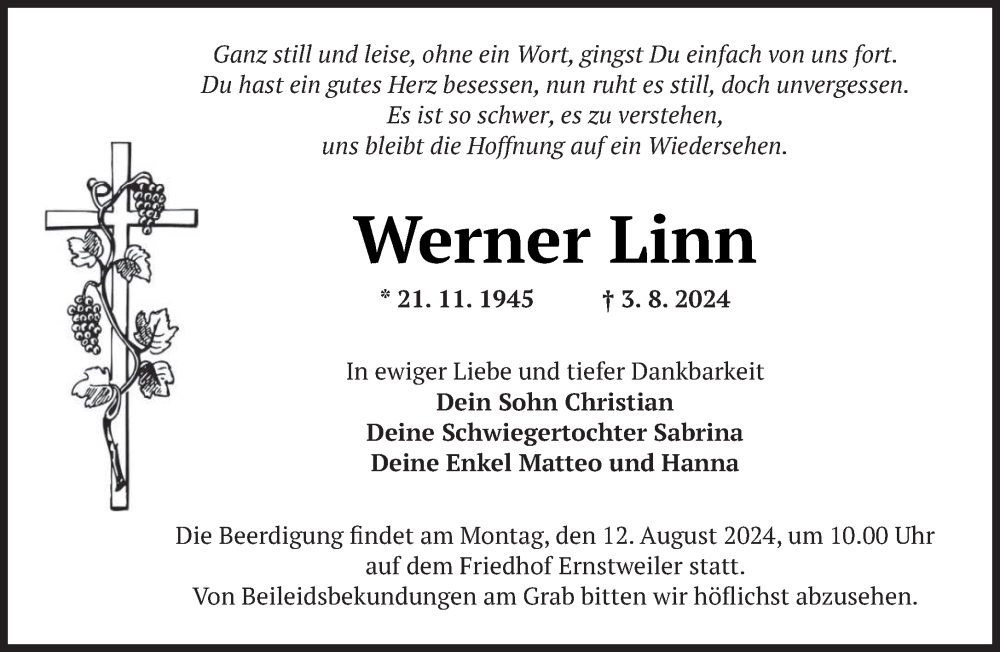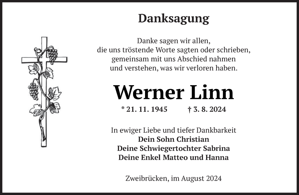 Hier finden Sie alle Traueranzeigen aus der Zeitung, die bisher für Werner Linn erschienen sind. Weitere Traueranzeigen, die in der Zeitung erscheinen, werden hier ebenfalls aufgelistet