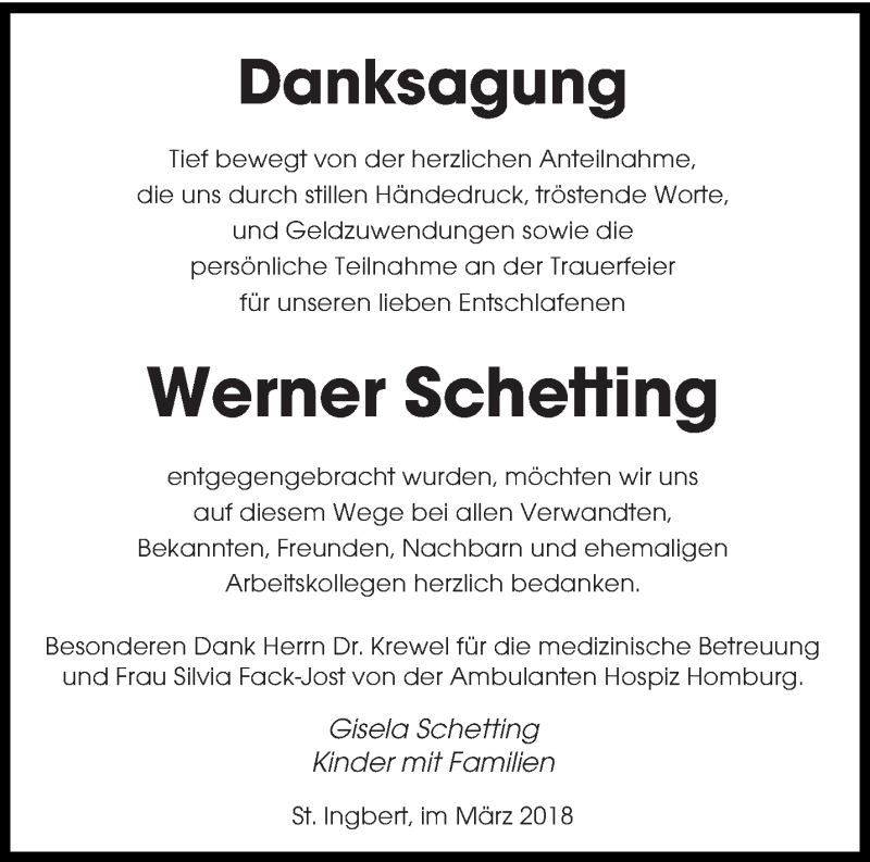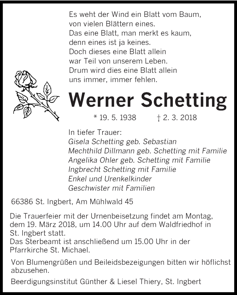 Hier finden Sie alle Traueranzeigen aus der Zeitung, die bisher für Werner Schetting erschienen sind. Weitere Traueranzeigen, die in der Zeitung erscheinen, werden hier ebenfalls aufgelistet