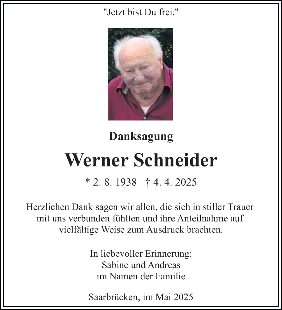 Hier finden Sie alle Traueranzeigen aus der Zeitung, die bisher für Werner Schneider erschienen sind. Weitere Traueranzeigen, die in der Zeitung erscheinen, werden hier ebenfalls aufgelistet