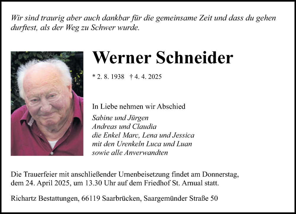 Hier finden Sie alle Traueranzeigen aus der Zeitung, die bisher für Werner Schneider erschienen sind. Weitere Traueranzeigen, die in der Zeitung erscheinen, werden hier ebenfalls aufgelistet
