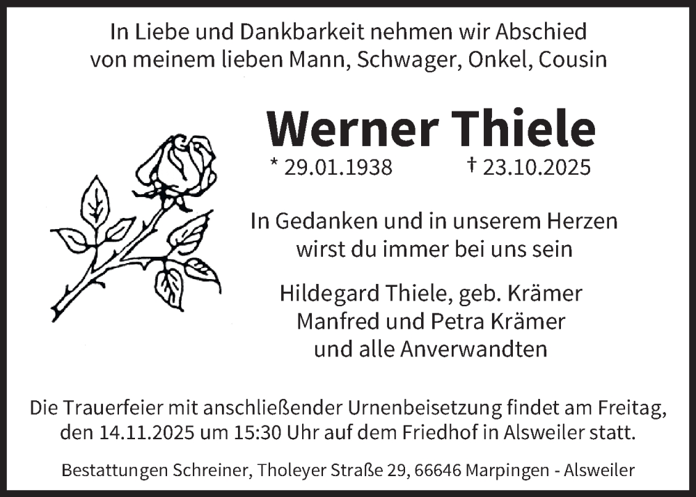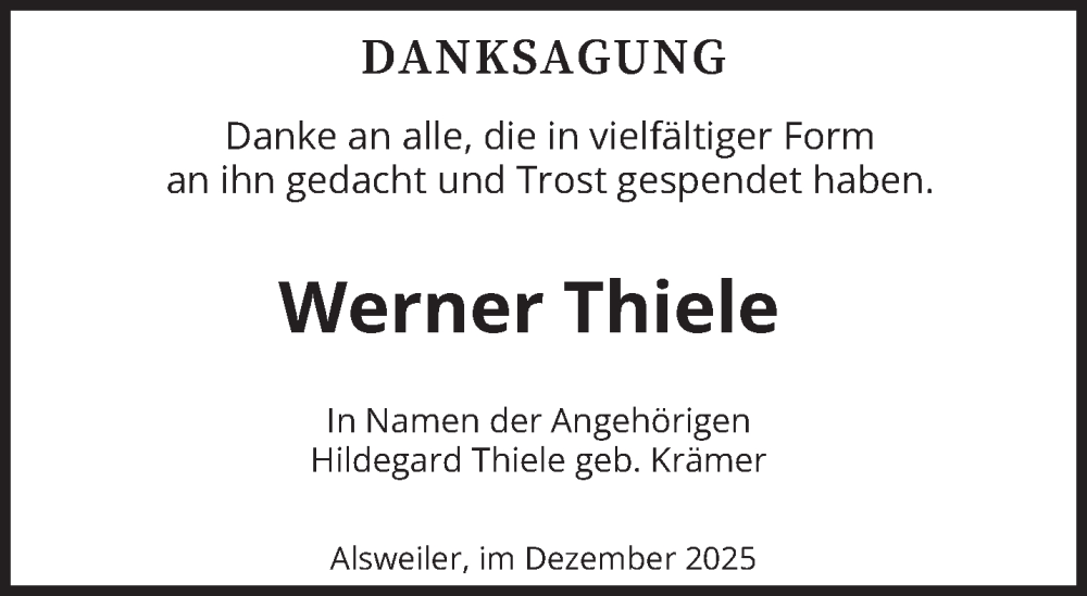 Hier finden Sie alle Traueranzeigen aus der Zeitung, die bisher für Werner Thiele erschienen sind. Weitere Traueranzeigen, die in der Zeitung erscheinen, werden hier ebenfalls aufgelistet