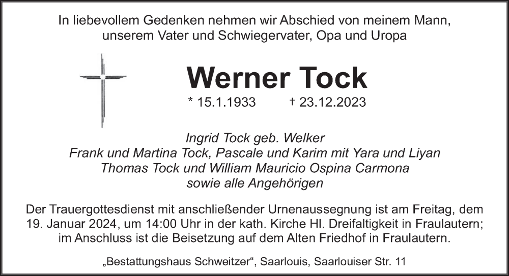 Hier finden Sie alle Traueranzeigen aus der Zeitung, die bisher für Werner Tock erschienen sind. Weitere Traueranzeigen, die in der Zeitung erscheinen, werden hier ebenfalls aufgelistet