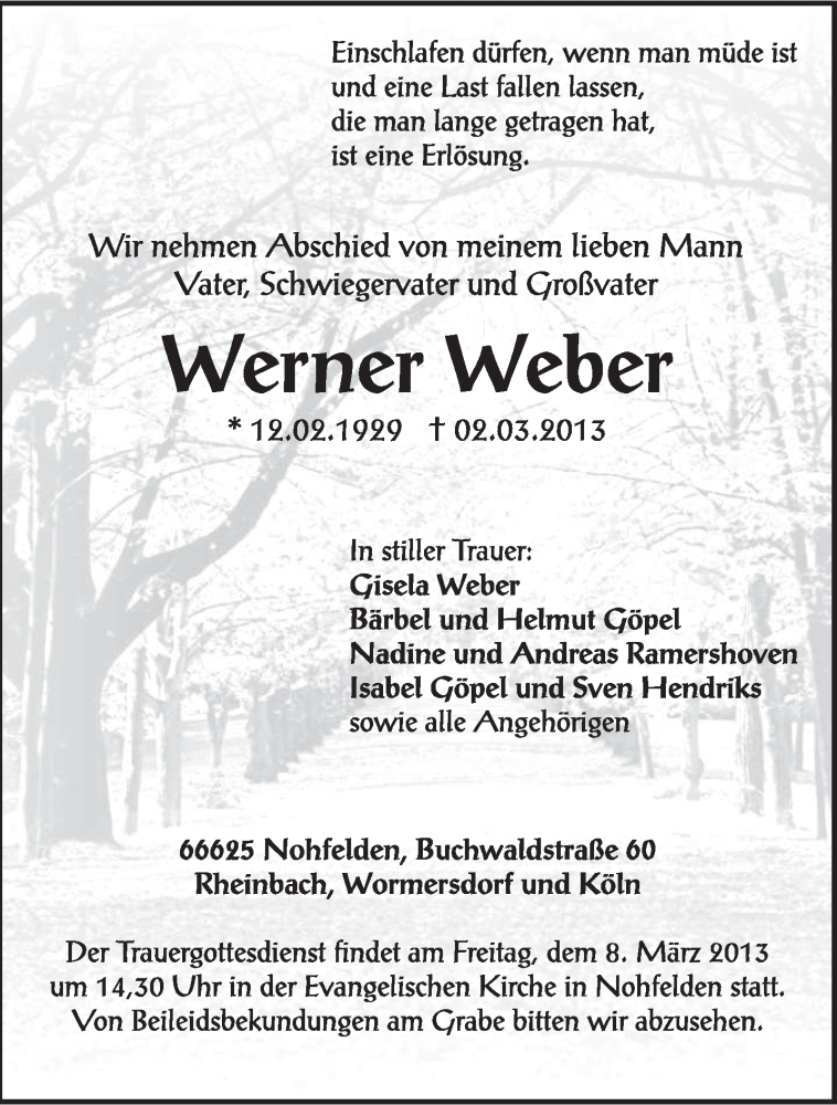 Hier finden Sie alle Traueranzeigen aus der Zeitung, die bisher für Werner Weber erschienen sind. Weitere Traueranzeigen, die in der Zeitung erscheinen, werden hier ebenfalls aufgelistet