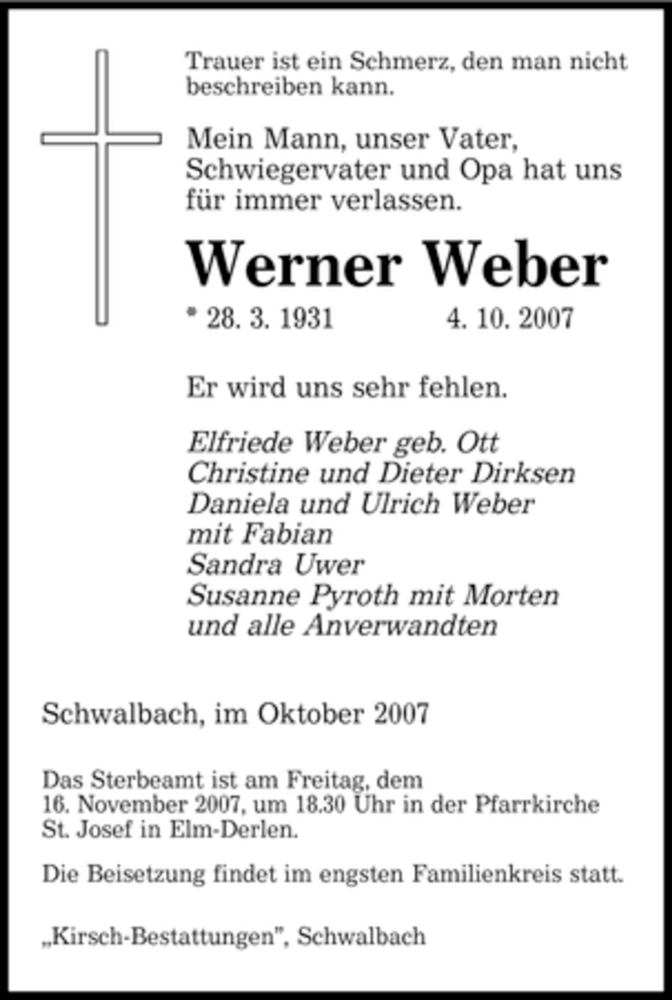 Hier finden Sie alle Traueranzeigen aus der Zeitung, die bisher für Werner Weber erschienen sind. Weitere Traueranzeigen, die in der Zeitung erscheinen, werden hier ebenfalls aufgelistet