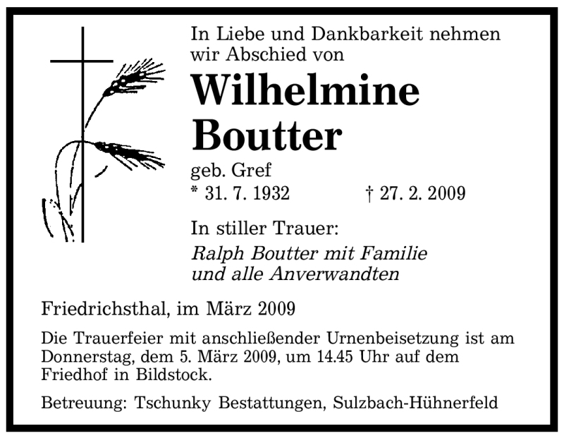 Hier finden Sie alle Traueranzeigen aus der Zeitung, die bisher für Wilhelmine Boutter erschienen sind. Weitere Traueranzeigen, die in der Zeitung erscheinen, werden hier ebenfalls aufgelistet