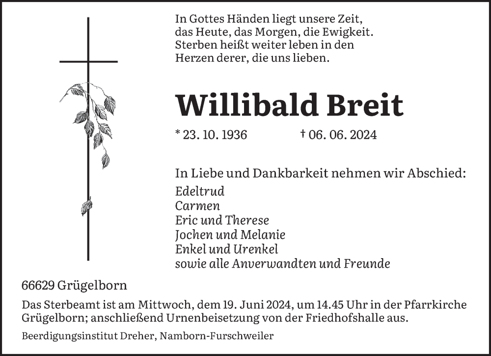 Hier finden Sie alle Traueranzeigen aus der Zeitung, die bisher für Willibald Breit erschienen sind. Weitere Traueranzeigen, die in der Zeitung erscheinen, werden hier ebenfalls aufgelistet