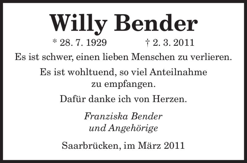 Hier finden Sie alle Traueranzeigen aus der Zeitung, die bisher für Willy Bender erschienen sind. Weitere Traueranzeigen, die in der Zeitung erscheinen, werden hier ebenfalls aufgelistet