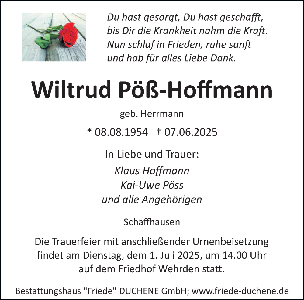 Hier finden Sie alle Traueranzeigen aus der Zeitung, die bisher für Wiltrud Poß-Hoffmann erschienen sind. Weitere Traueranzeigen, die in der Zeitung erscheinen, werden hier ebenfalls aufgelistet