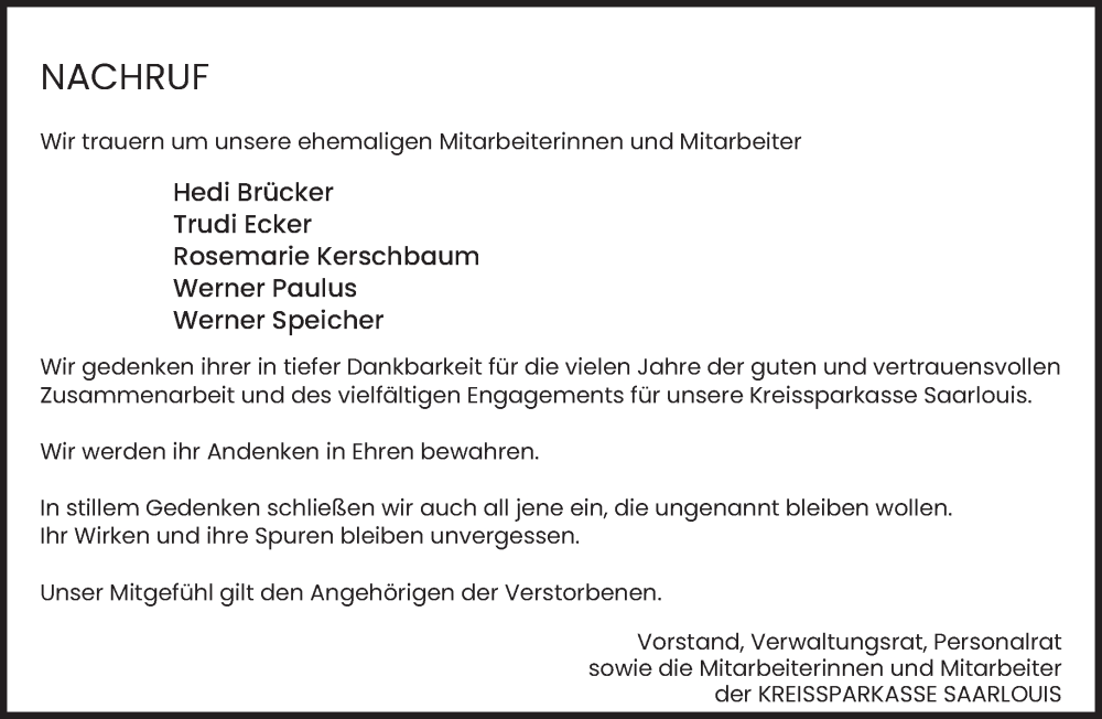 Hier finden Sie alle Traueranzeigen aus der Zeitung, die bisher für Wir trauern der KREISSPARKASSE SAARLOUIS erschienen sind. Weitere Traueranzeigen, die in der Zeitung erscheinen, werden hier ebenfalls aufgelistet